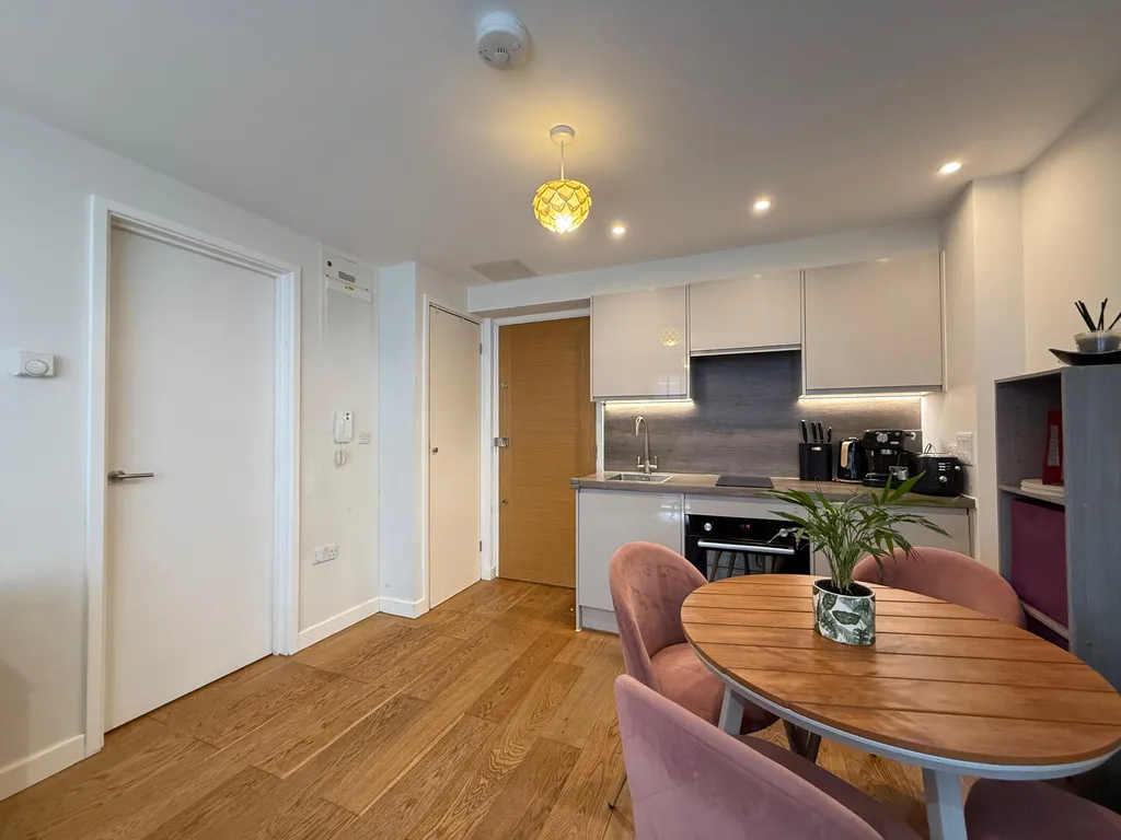 Upon entering, you are welcomed into a bright open-plan lounge and kitchen, creating an inviting and versatile space ideal for modern urban living. The layout seamlessly combines living, dining, and cooking areas, allowing the room to feel spacious and functional.
