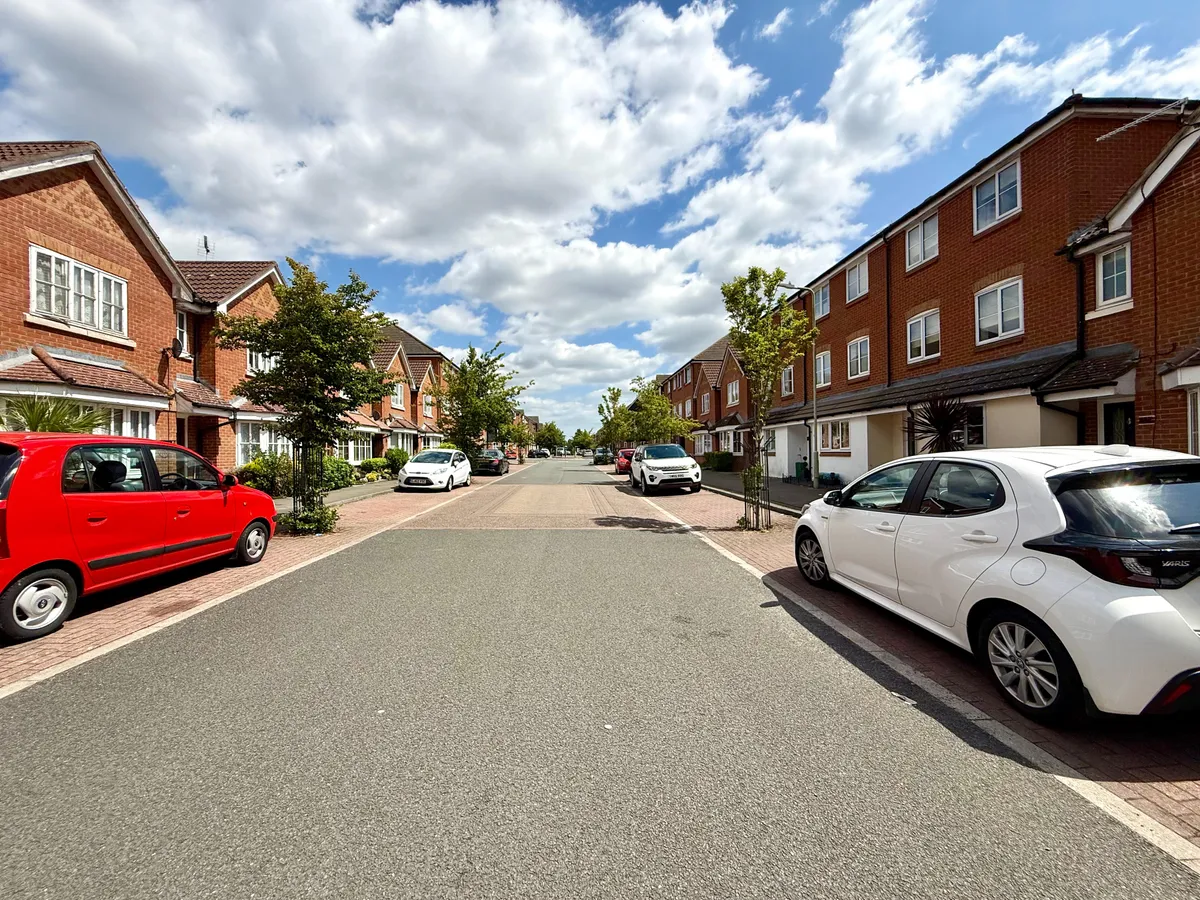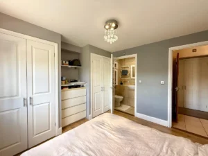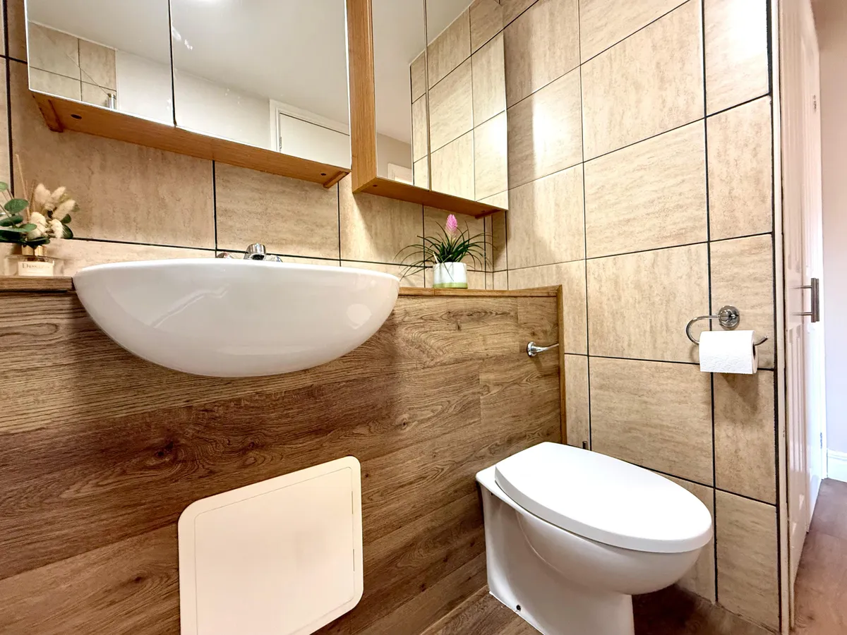 There are two double bedrooms, both with built-in wardrobes, an en-suite to the master bedroom, and a large family bathroom with a utility cupboard, adding to the functionality of the home. Additional benefits include electric heating fitted throughout the property, providing instant warmth during colder months, and a residential parking area located right outside the front entrance.
