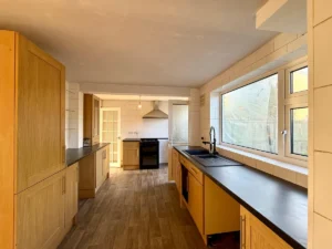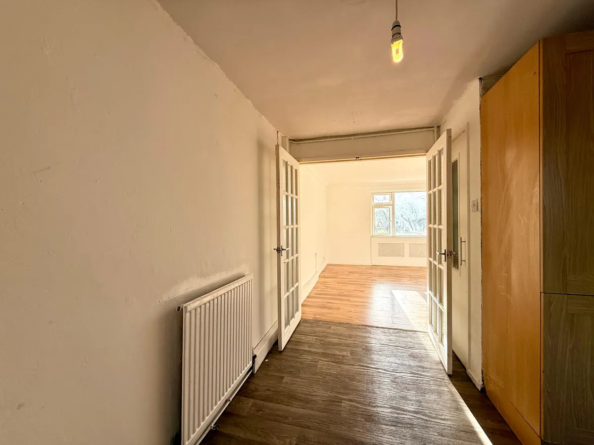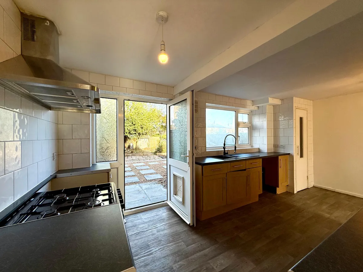 Walking through the entrance hallway, it provides access to a spacious living room featuring a front-facing double-glazed window and elegant wooden French doors leading to the kitchen. The kitchen offers a practical space for a dining table and has been thoughtfully designed for everyday living, complete with matching wall and base cabinets. The ground floor is fitted with laminate flooring throughout, providing a low-maintenance finish, while the large, double-glazed windows allow natural sunlight to flood the space, creating a bright and welcoming atmosphere.