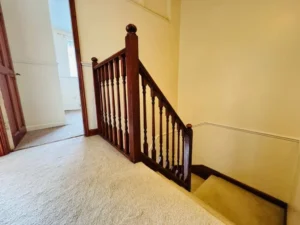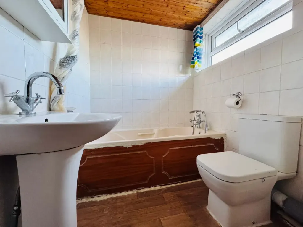 Upstairs, you'll discover three genuinely generously sized bedrooms each offering ample space for the whole family. The family bathroom features a classic white suite with bath, WC, and pedestal basin, complemented by attractive tiling and characterful wooden ceiling beams that add warmth and charm to the space.