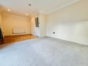 Upon entering through the enclosed front porch, you're greeted by a spacious hallway leading to a bright and airy living room. The generous reception room features attractive wood-effect laminate flooring, with a large window flooding the space with natural light ideal for comfortable living and entertaining.