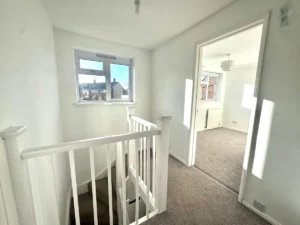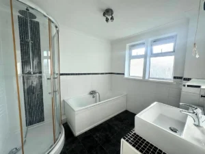 Upstairs, you’ll find three generously sized bedrooms, each comfortably accommodating a double bed. The family bathroom is equally impressive, featuring both a bathtub and a separate enclosed shower, offering versatility for busy households.