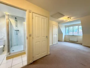 The second floor is dedicated to an impressive main bedroom suite, featuring dual-aspect skylights that flood the room with natural light. There is ample space for both sleeping and working or relaxing, making it a comfortable and flexible retreat. A private en-suite shower room completes the second floor.