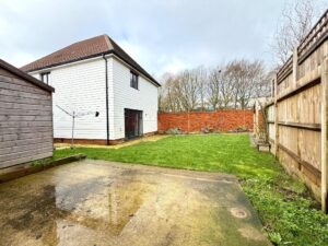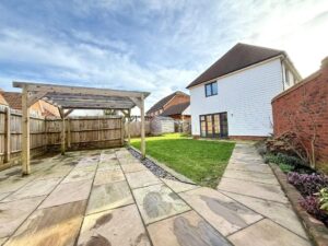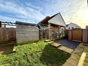 Externally, the landscaped rear garden has been expertly designed to provide a private and serene retreat, with patio space ideal for alfresco dining, entertaining guests, or unwinding in peaceful surroundings, and large sheds for additional storage. In terms of parking facility, there is a covered carport with EV charging point offering secure parking for two cars, and an on-road parking space.