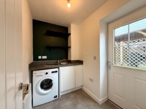 The impressive open-plan kitchen and dining area forms the heart of the home, featuring integrated appliances, sleek cabinetry, and expansive work surfaces. A separate utility room with an additional sink provides enhanced practicality while preserving the home's clean and elegant aesthetic. Completing the ground floor is a stylish cloakroom and a discreet internal meter cupboard.